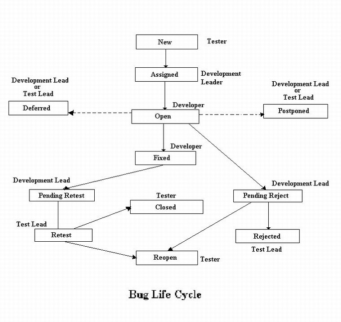 (Right from the first time any bug is detected till the point when the bug is fixed and closed, it is assigned various statuses which are New, Open, Postpone, Pending Retest, Retest, Pending Reject, Reject, Deferred, and Closed.